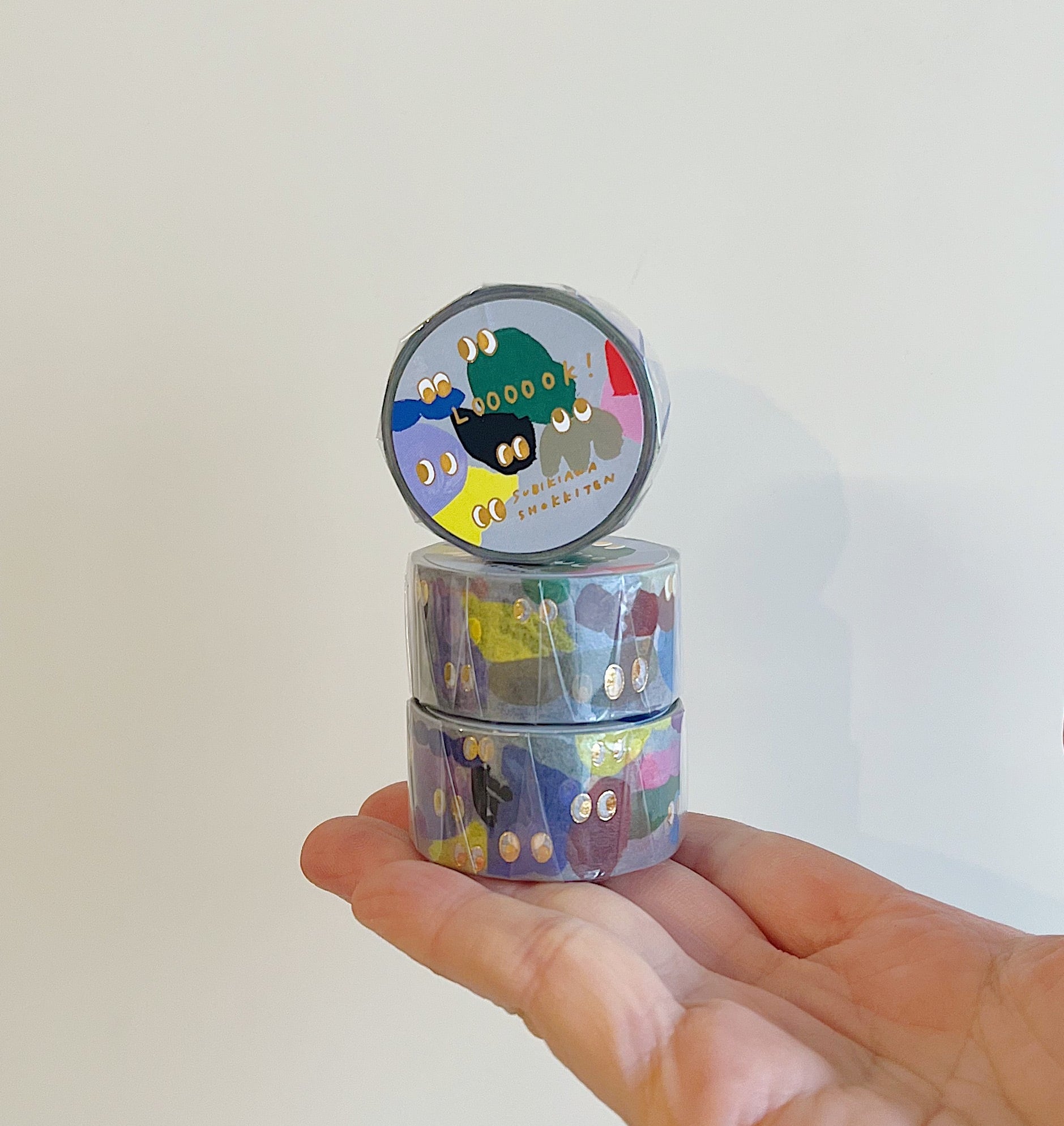 イラスト制作やガラス食器の絵付けなどを手がける作家・Subikiawa.さんがデザインしたマスキングテープです。キラリと光る箔押しのゴールドのお目めと目が合います。ポップでユーモアのある楽しいマスキングテープです。